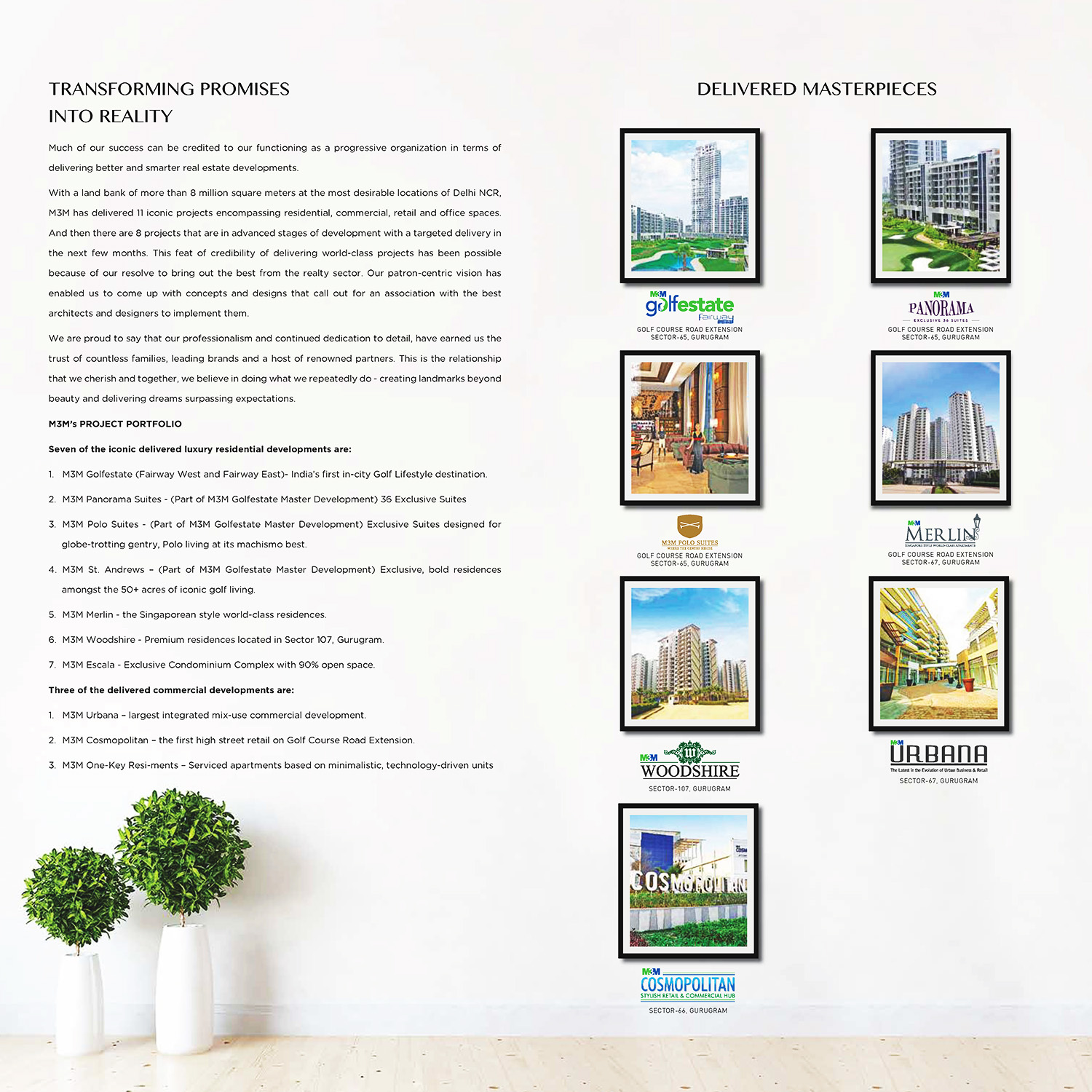 Disclaimer:- Welcome to M3M Highstreet (“Website”). The contents of this website are for general informational purposes only. By using or accessing this Website and/or the hyperlinks embedded/ mentioned in the Website you agree to abide by the terms and conditions, as set forth herein and as contained in the Website without any qualification or limitation. In the event you do not accept/ agree to the terms of this Disclaimer, you are requested not to use the Website or download materials from the Website. Every endeavor has been made to keep the information updated. However, we make no representations or warranties of any kind, express or implied, about the completeness, accuracy, reliability, suitability or availability with respect to the Website or the information, products, services, or related graphics contained in the Website for any purpose. The Website and all its content are provided on an “as is” and “as available” basis and is intended for informational purposes only. No information given under this Website shall be treated as a warranty or representation by us. Your use of the Website is solely at your own risk. This Website is for guidance only. It does not constitute part of an offer or contract. The contents, including design and specifications are subject to change without prior notice. Computer generated images are the artist’s impression and are an indicative of the actual designs. By using and/or accessing this Website, you, the viewer/user acknowledge that the information including any material/ documents (such as brochures and marketing collaterals) on this Website are solely for informational purposes and you have not relied on this information for making any booking/ purchase/ intention to purchase/ invest in any project(s) of M3M Highstreet and/or its affiliates. Nothing herein shall be construed as any invitation, or offer for investment or deposit within the terms of the applicable law (as amended from time to time) including without limitation SEBI Act, 1992, Companies Act 2013 etc. and we shall not be liable for any consequence of any action taken by the viewer relying on such material/ information on this Website. The particulars contained on the Website mention details of Projects/ developments undertaken by M3M Highstreet and/or its affiliates. The contents are being modified in terms of the stipulations/ recommendations under the Real Estate Regulation Act, 2016 and Rules made thereunder (“RERA”) and accordingly may not be fully in line thereof as of date. Use of information shall be governed by Indian laws, RERA; subject to jurisdiction of Competent Authority under RERA, courts at Gurugram/ Haryana India. You are further advised to verify all the details, including area, amenities, services, terms of sales and payments and other relevant terms independently with the sales team independently, subject to prior appointment during working hours and speak to one of our sales staff, prior to concluding any decision for buying any unit(s) in the said project. In no event shall M3M Highstreet, its affiliates, employees, directors and/or officers be made liable for any claim as a result of any inaccuracies in the information provided in this Website, though all efforts have to be made to ensure accuracy and under no circumstances shall we be liable for any expense, loss or damage including, without limitation, indirect or consequential loss or damage, or any expense, whatsoever arising from use, or loss of use, of data, arising out of or in connection with the use of this Website.